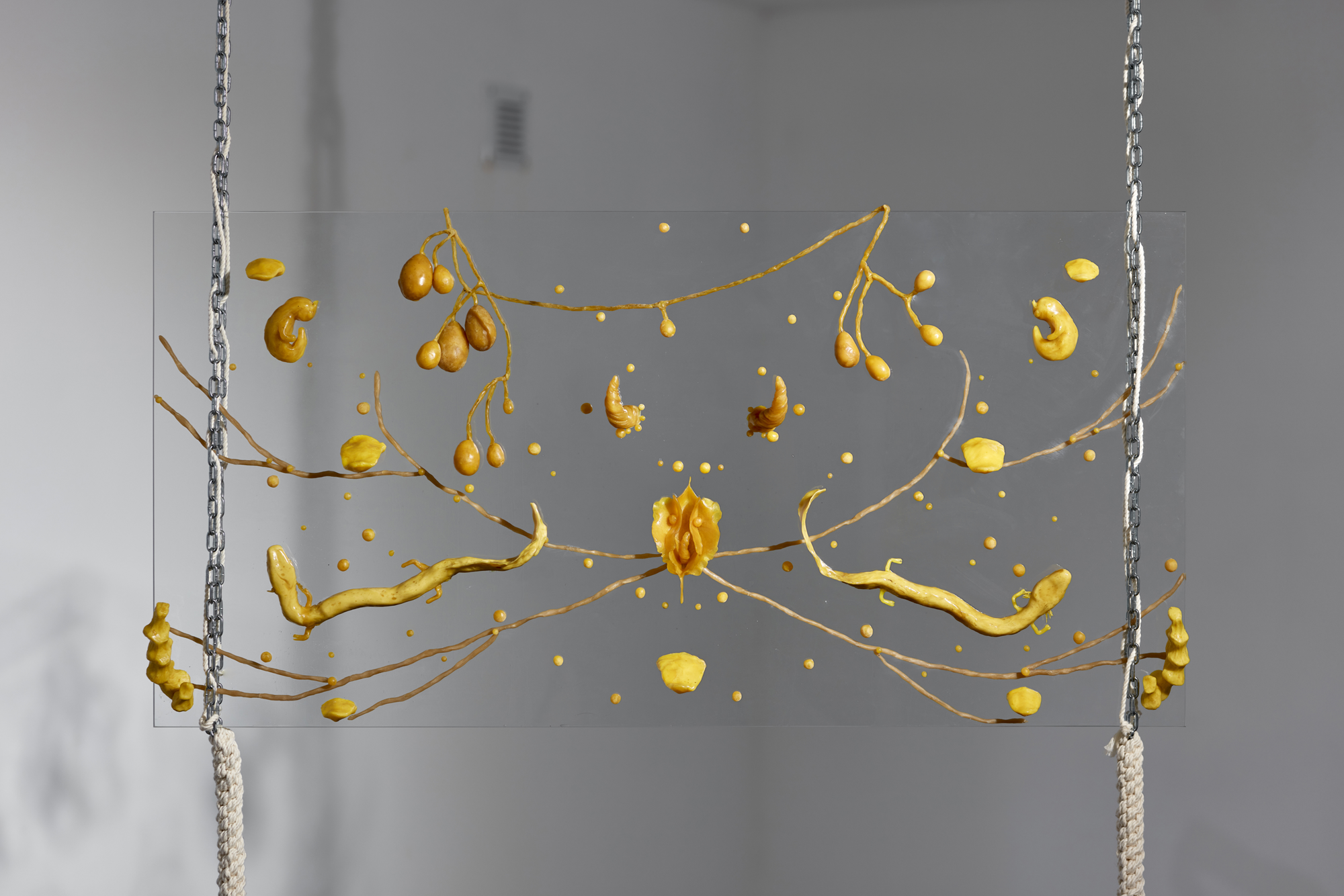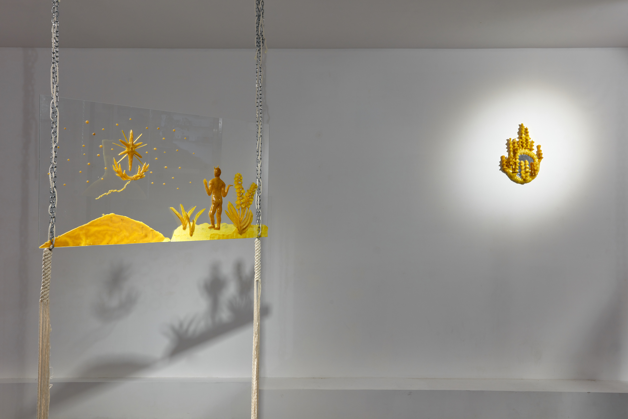 Faun with a hard-on looks into the advanced future (100x50 cm, beeswax, glass, chains, macrame, ISBN – könyv+galéria, 2021), photo: Dávid Bíró