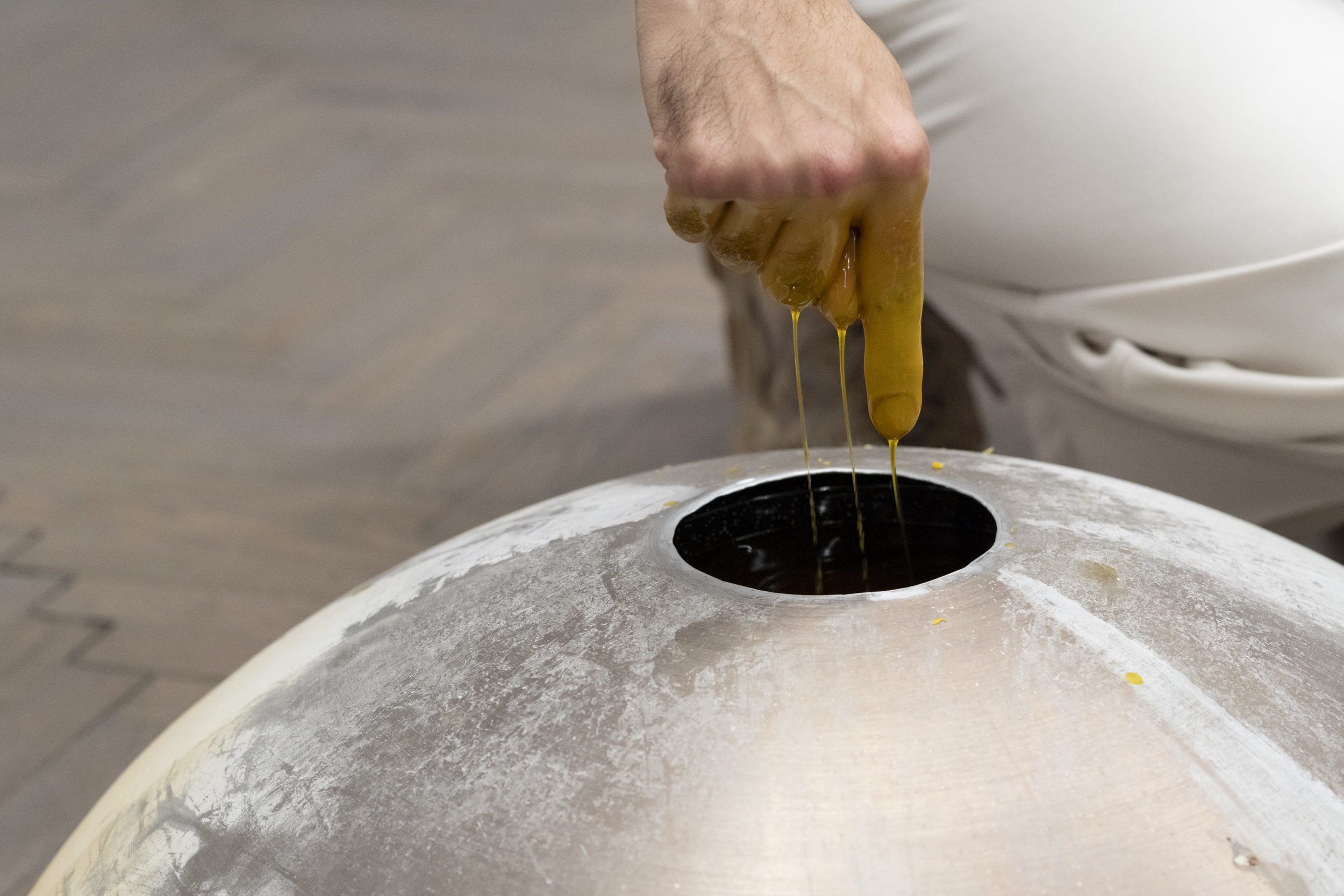 The very material in which Gideon Horvath works is also a unique representation of corporeality. Because of its softness and warm color, beeswax resembles human flesh, but comes from a different animal. It is, in the artist’s words, a “visceral” material, because it is created in the bee’s lower abdomen. Very intimate and sensual. In the wax-based creative process, a unique connection is created between the artist and the creatures from which the material comes. The wax itself, according to Horvath, is a kind of portrait of this “visceral” quality created in the bee’s body. This access to inner corporeality seems to point to Horvath’s desired state of physical and emotional exposure, representing a form of emancipation other than heroism as traditionally understood. The fascination with corporeality, understood also as the interiors of various bodies, recurs in the subsequent works presented in the exhibition: the interiors of decaying fruits, vases (from antiquity imitating human bodies) or abundance, pouring out of an ancient horn like, to quote the artist, “never-ending bodily fluids.”