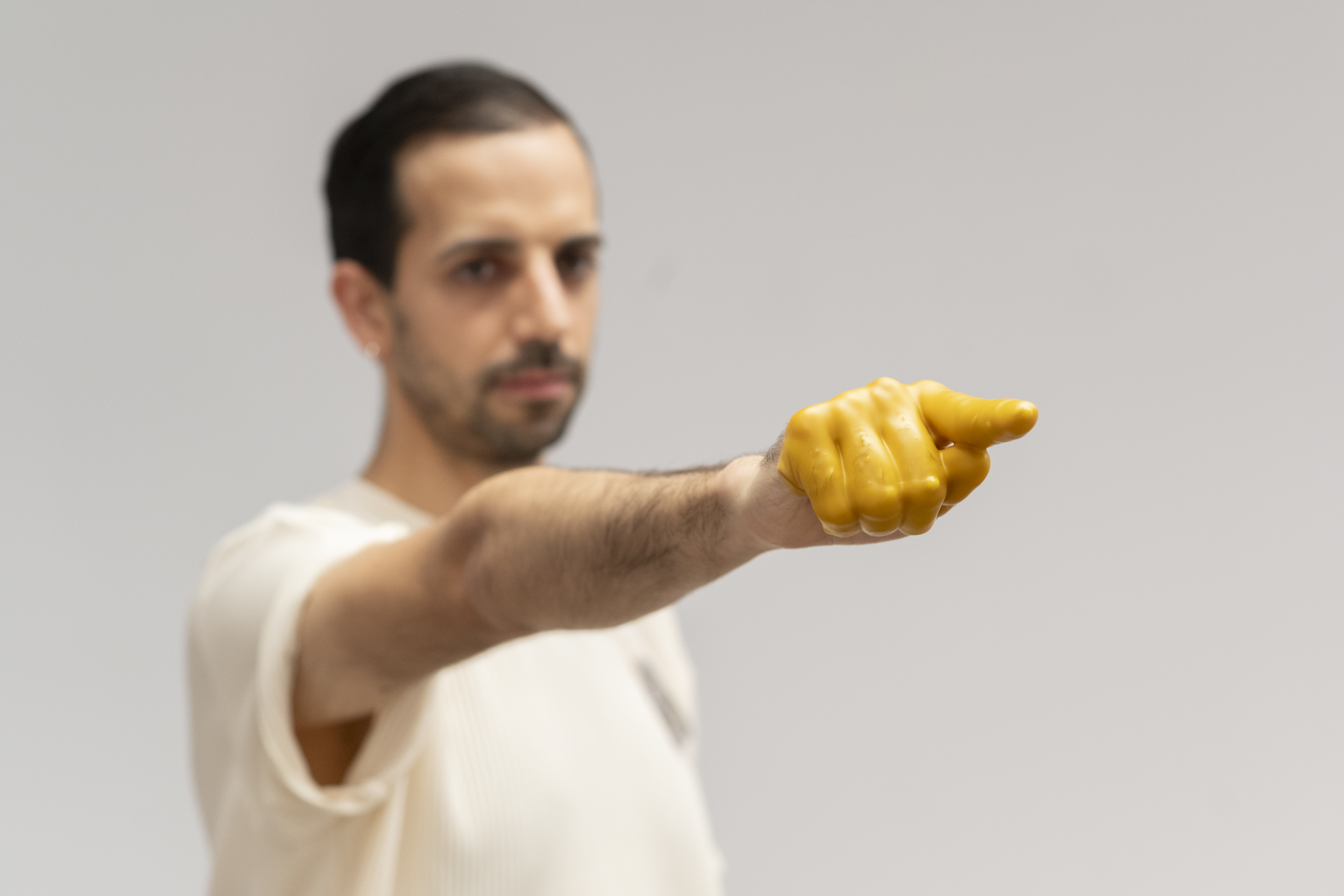 Standing in a corner of the room, the wax-made vase resembles a soft human body. It is covered with black stigmas and topped with a pointed cap [Dunce Cap]. In the 19th century, in European and American schools, undisciplined students or children who were slower learners were shamed by being forced to wear such a headdress. This work was made in 2023, when Gideon Horváth was awarded—the most important award for young Hungarian artists—the Esterhazy Prize. As part of the competition, he was to present Memory That Could Have Been, a sculptural installation dedicated to the history of the city’s non-heteronormative residents at the Ludwig Museum in Budapest. The installation had to appear with a censored concept due to the “Propaganda Law” passed by the government in 2021 and still in force—a law prohibiting the depiction and promotion of diverse gender identities and sexual orientations. As a result of these developments, a new work appeared at the museum in the middle of the installation. The Vase of Shame acted as a coded message there about the shame of taking part in censoring, but also about the shaming the young artist subsequently faced from parts of his community. On the one hand, it is a story about the production of a culture of shame that takes away agency; on the other, about the expectation of heroism from a repressed homosexual artist.
